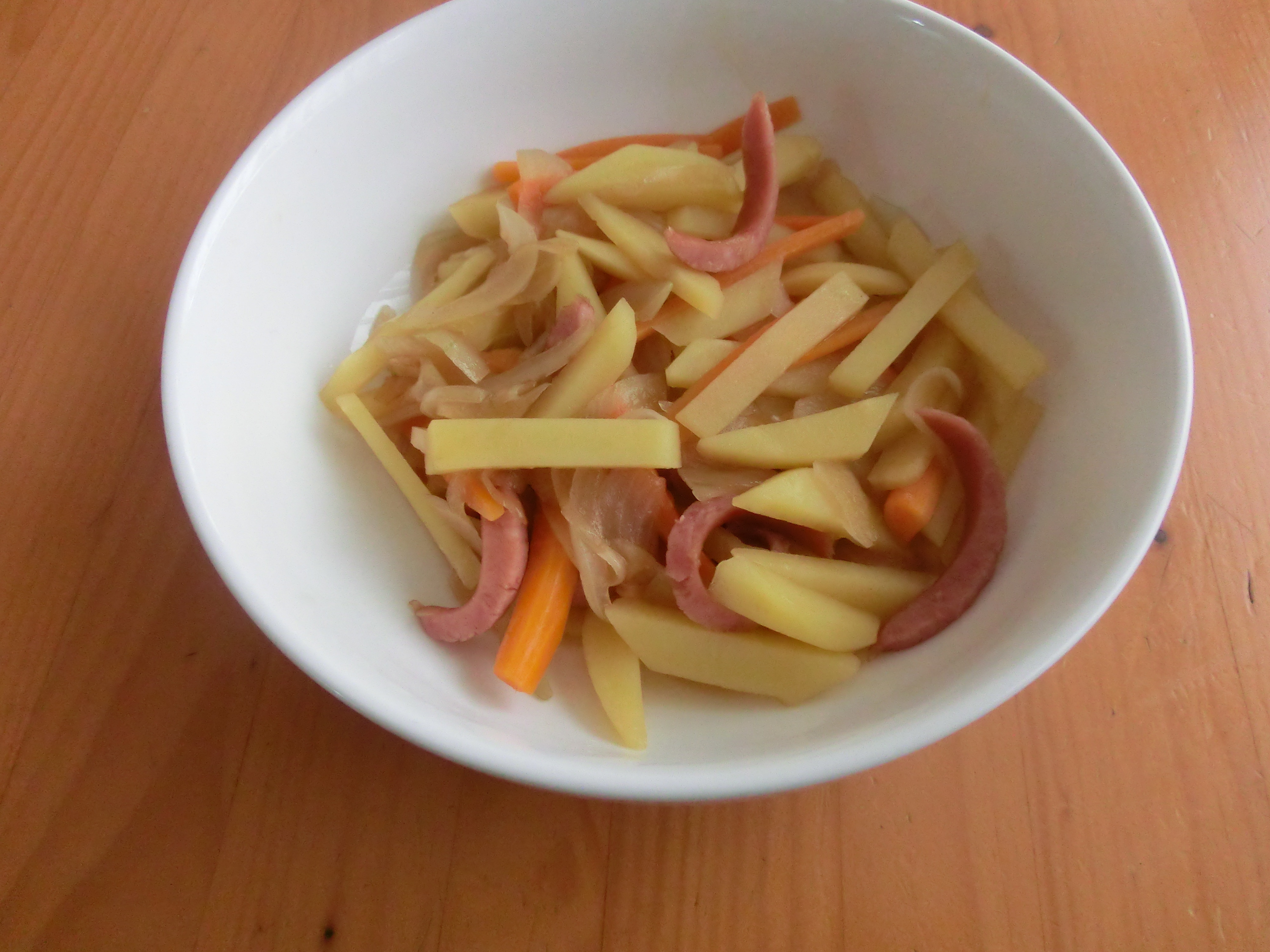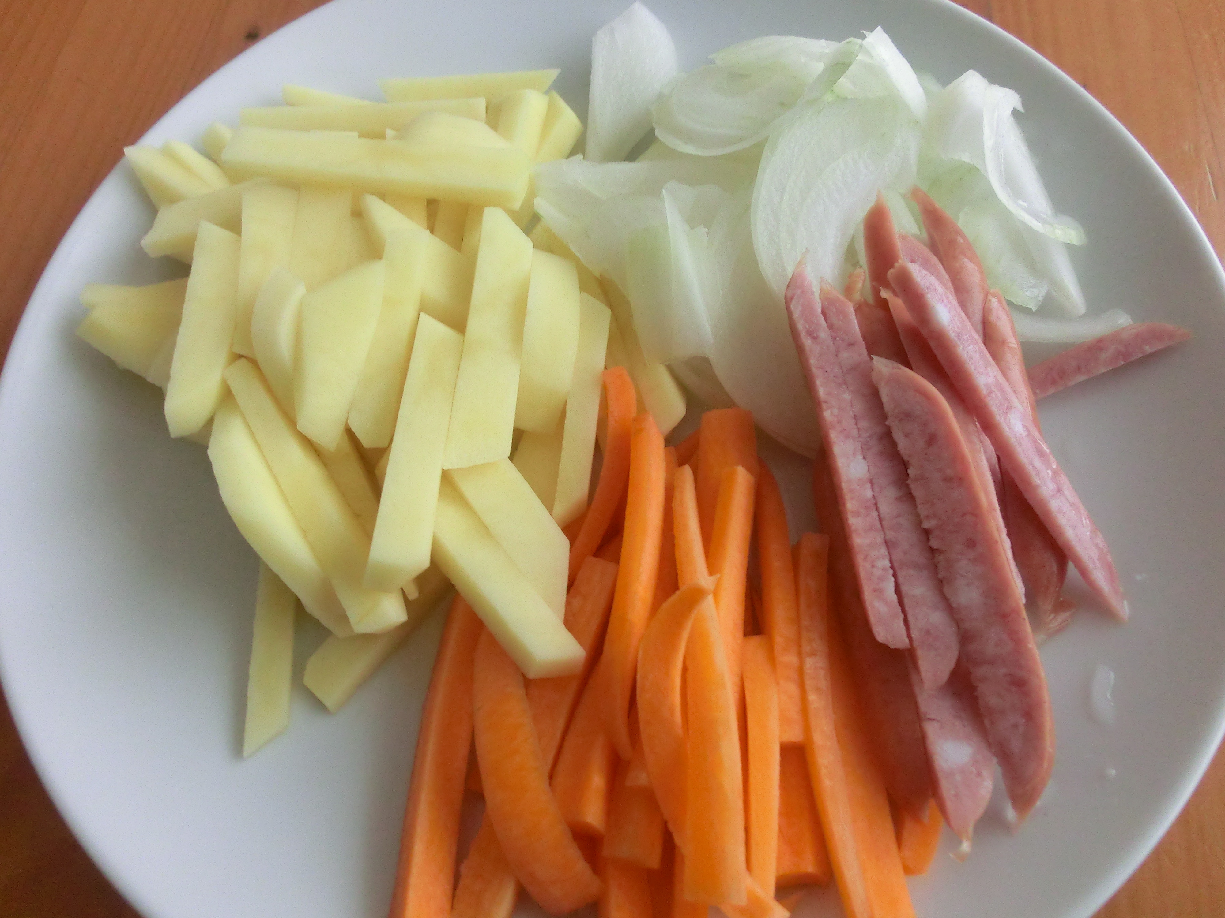 - 玉ねぎ、人参、じゃがいも、ソーセージは細長く切ります。じゃがいもは切った後、水でサッと洗い水切りをします。