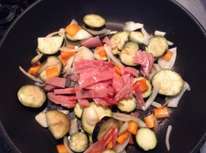 | 3、フライパンにバターを入れてニンニクと玉ねぎとなすとにんじんとベーコンを入れてじっくり炒めます。