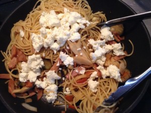 | 6、パスタと茹で汁をお玉に一杯フライパンに入れて手早く炒めて、最後にリコッタチーズを入れて混ぜたら完成です! |