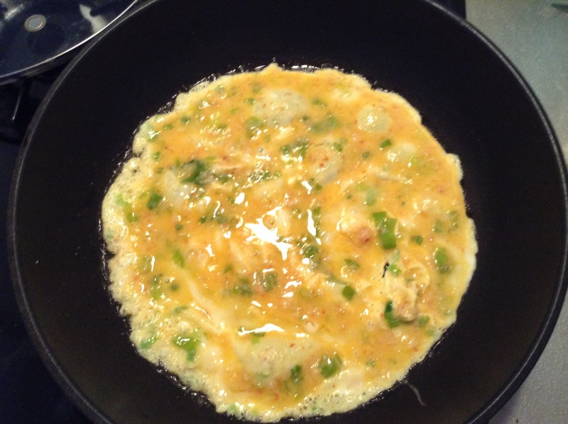 | 3、ボウルに卵と青ネギとカニと塩コショウをいれて混ぜます。