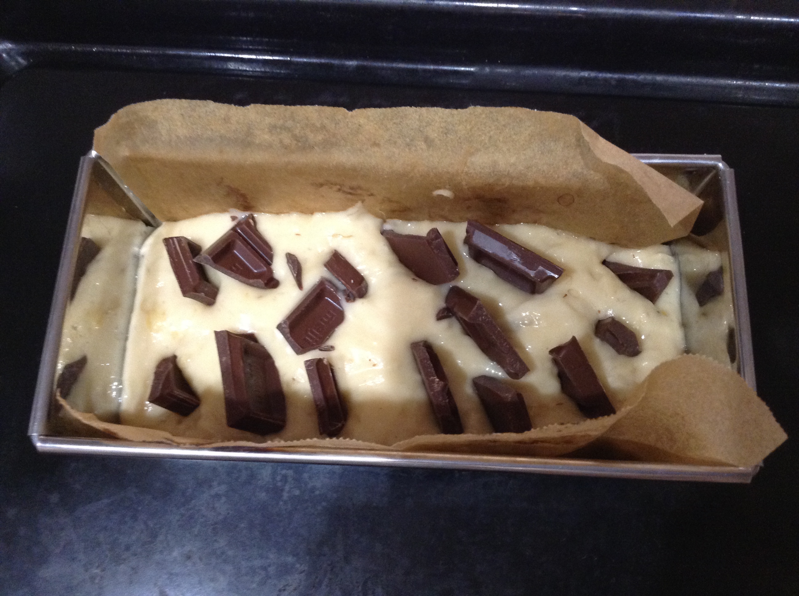 5、パウンド型に生地を流し込んでから、板チョコを手でパキパキ割ってさしていきます。