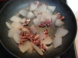 タコと大根を茹でることです。1手間なのですが、タコの臭みをなくし大根をジューシーに仕上がるためには欠かせません。