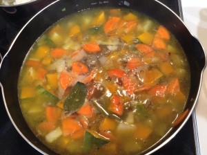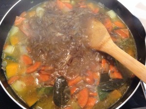 6、ここで飴色玉ねぎも加えて野菜が柔らかくなるまで煮込みます。