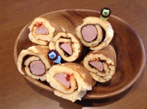 4、焼きあがったら熱いうちに魚肉ソーセージとケチャップとマヨネーズを、ホットケーキにおいてくるくる巻きます。 |