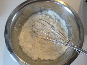 1、薄力粉とベーキングパウダーと砂糖と塩を入れて混ぜます。 |