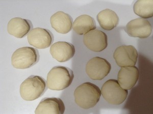 5、生地を16等分にします。10分ベンチタイムをして休ませてからもう1度丸めなおしてクッキングペーパーをしいた型に入れます。 |