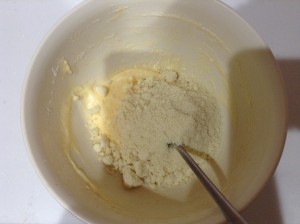 1、バターをクリーム状に練って、砂糖を入れてよく混ぜます。(白っぽくなるまで) |