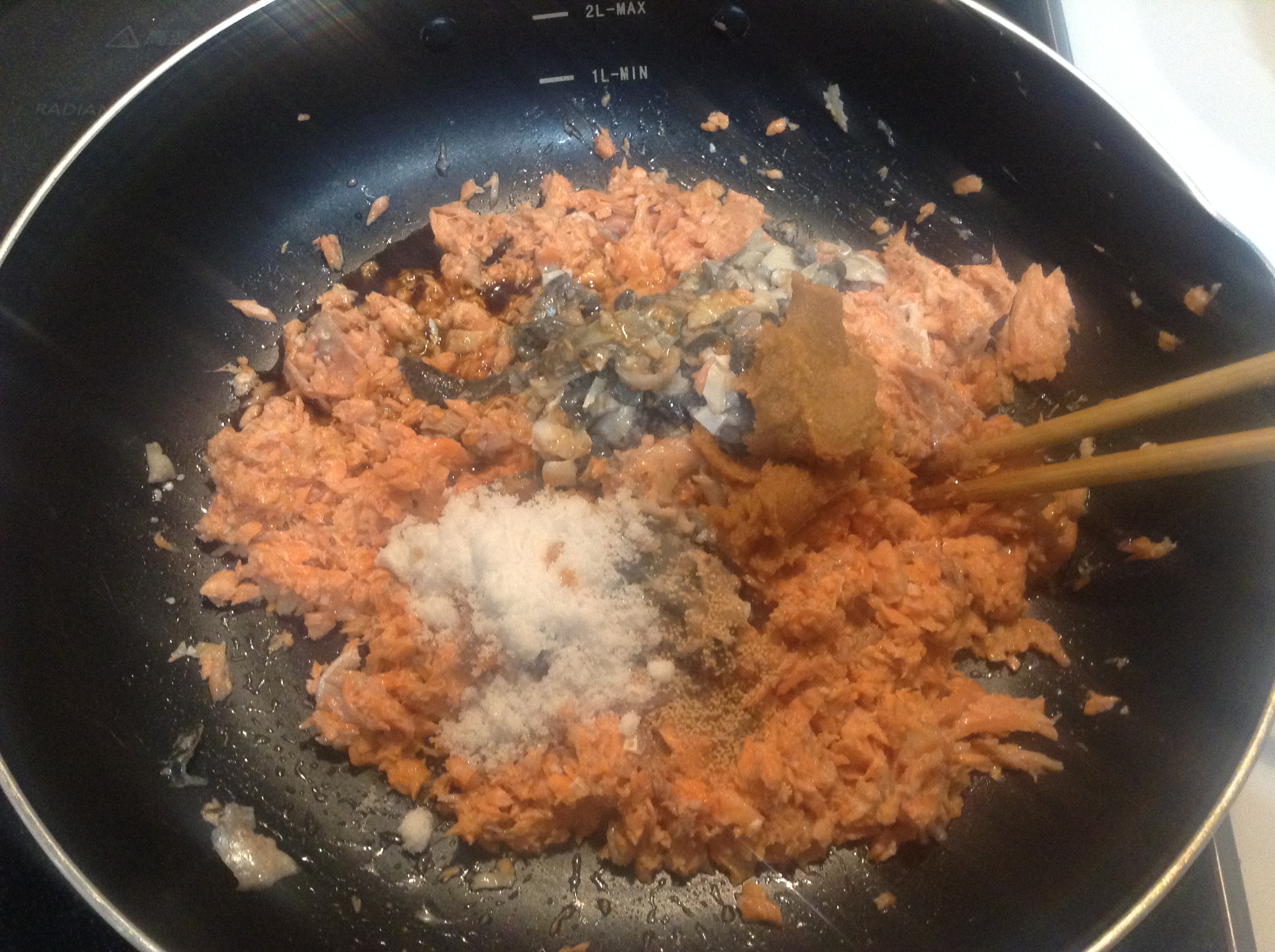 4、フライパンにほぐした鮭、刻んだ皮、味噌、醤油、砂糖を入れて火にかけます。 |
