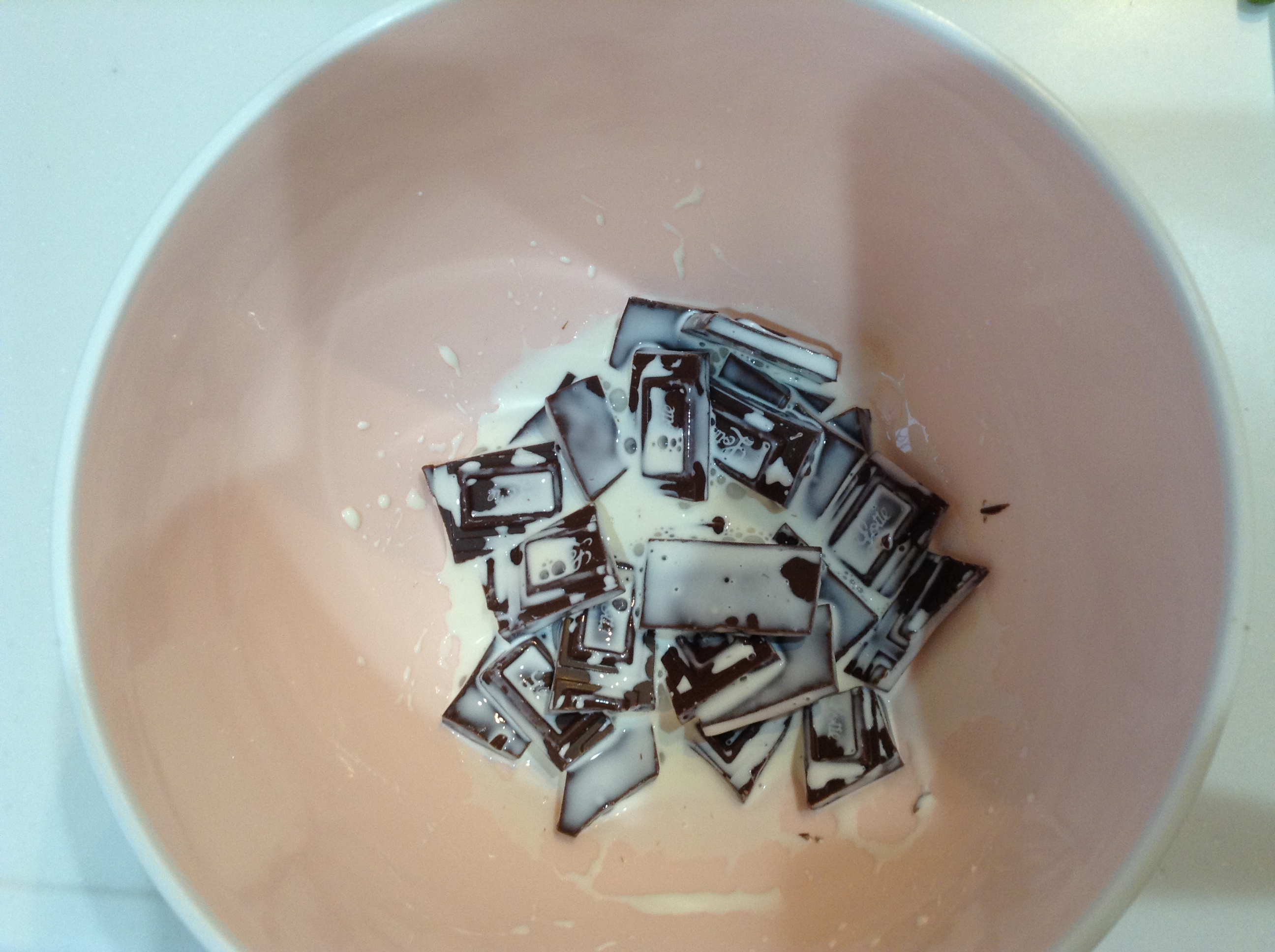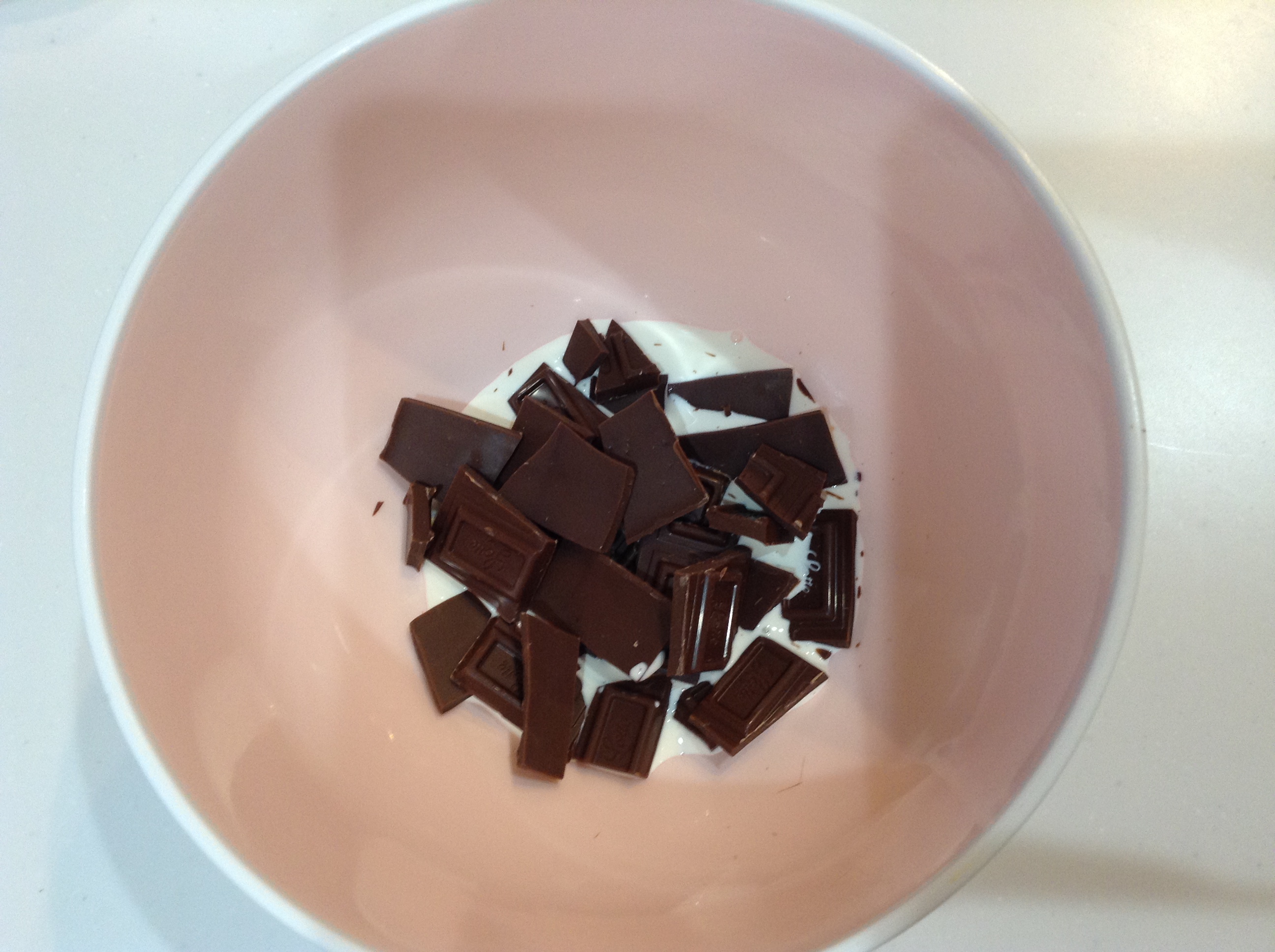 1、チョコは細かく割って生クリームと一緒に耐熱容器に入れます。