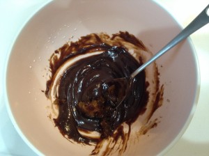 2、レンジにかける前にしっかりと混ぜてチョコに生クリームをまぶしておきます。