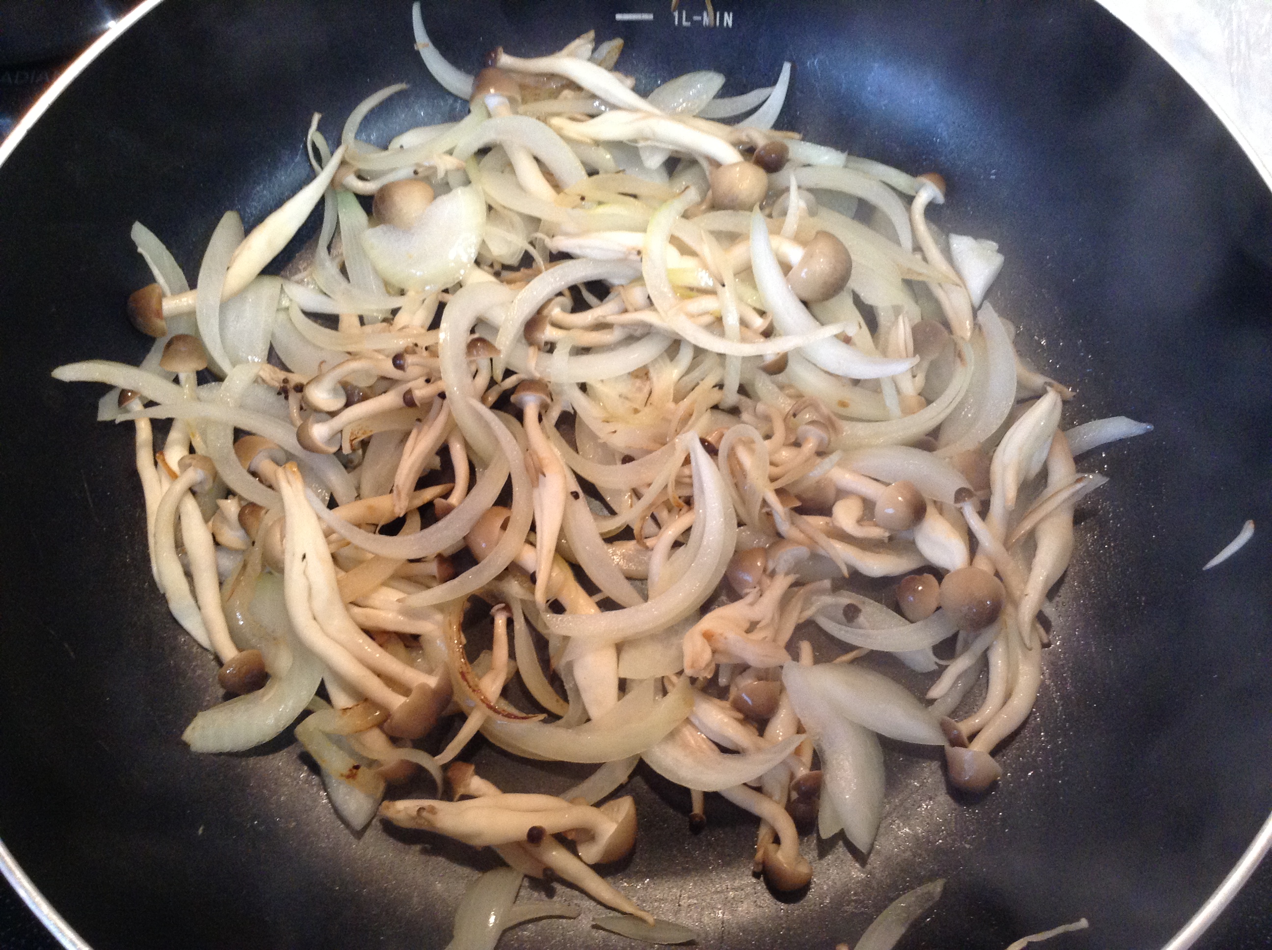 3、玉ねぎが透き通ってきたらシメジを入れて炒めます。