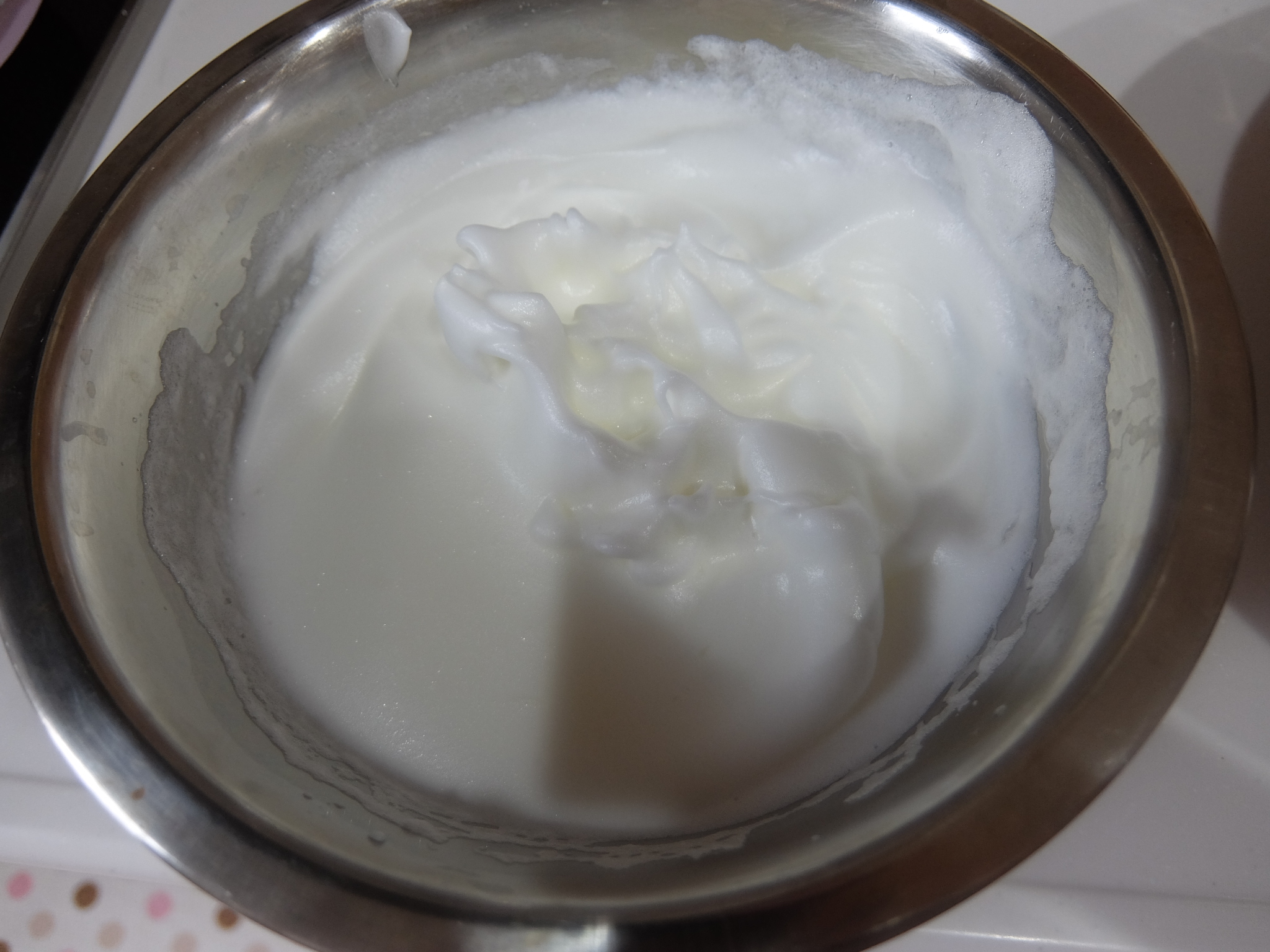 メレンゲを泡立てる時は砂糖を後から入れてください。最初から入れてしまうとコシの無いだれたメレンゲになってしまいます。