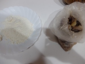 2、醤油、砂糖、酒、すりおろしニンニクを入れたビニール袋に入れて最低1時間冷蔵庫で休ませます。(できれば1晩)