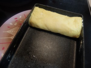 今回は明太子を半生に仕上げたいので弱火でじっくりと焼いています。しっかり火を通したい場合は(お弁当に入れるときなど)は火力を強めて作ってくださいね♪卵をくるくる巻くときに箸よりもフライ返しのほうが上手にできますよ!