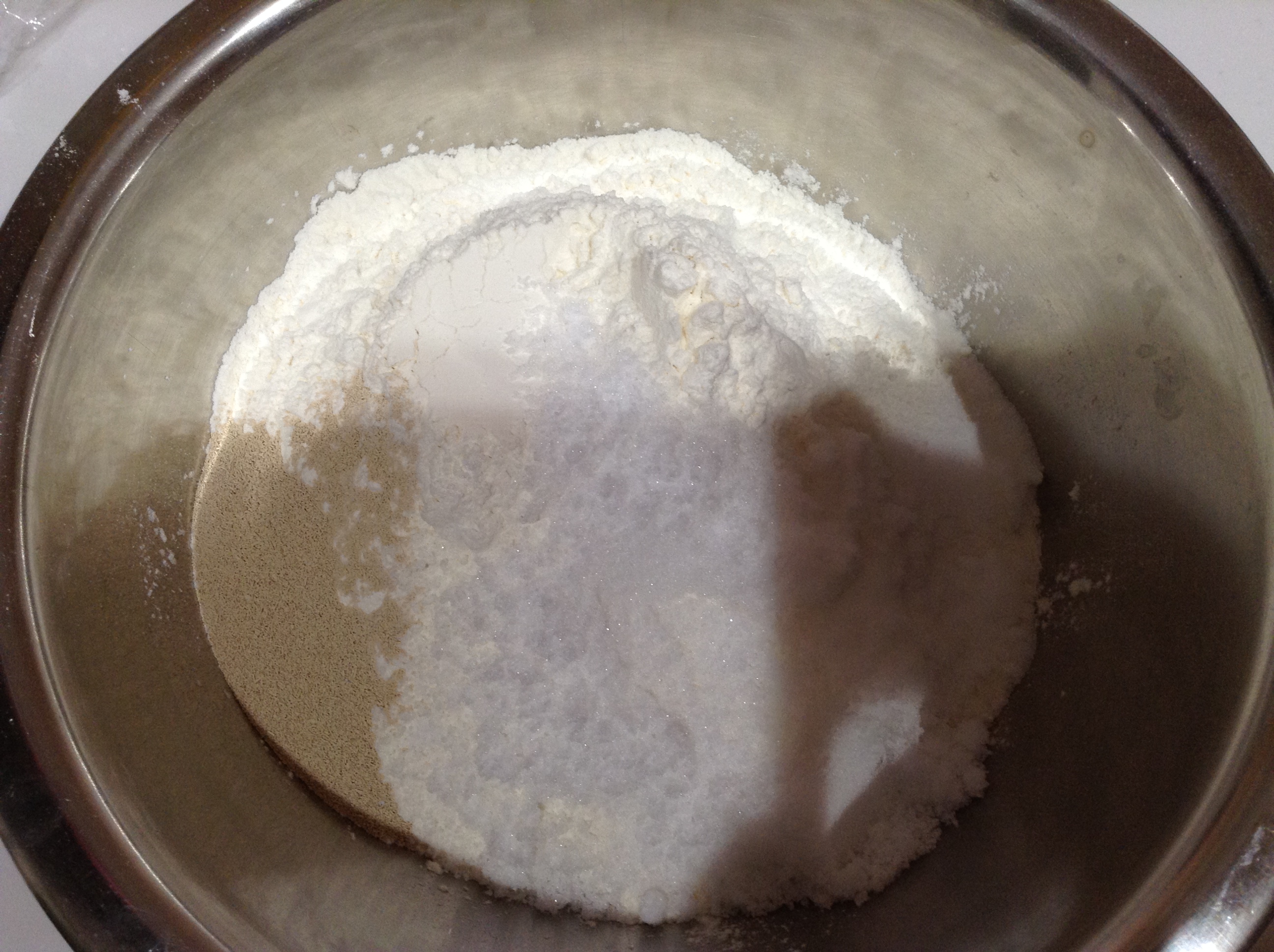 1、ボウルに強力粉、塩、ドライイーストを加えます。