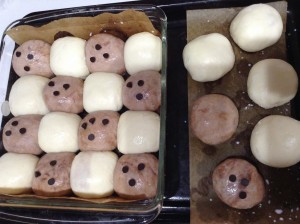 4、生地を半分にして、片方にはココアを入れて混ぜます。そのまま1次発酵して2倍に生地が膨らむまで休ませます。