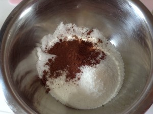 1、ボウルに薄力粉、砂糖、ココア、塩を加えて混ぜます。 |