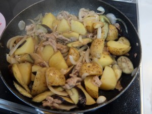 3、1に食べやすく切った豚肉とナスと玉ねぎを入れて炒めます。