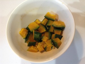 かぼちゃは火が通りにくいのであらかじめレンジで加熱しておきます。鮭とかぼちゃと枝豆を最後に加えることで煮崩れることなく色も鮮やかに仕上げています。