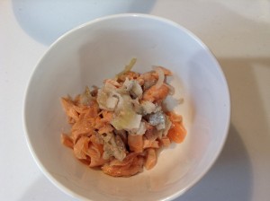 鮭とホクホクのかぼちゃが美味しいクリームパスタです。枝豆の色も綺麗です。子どもが大好きな味になりました。