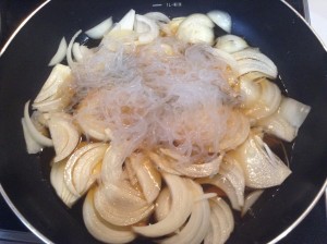 1、フライパンに醤油と砂糖と酒とみりんとだしの素と水を加えて煮立たせます。 |